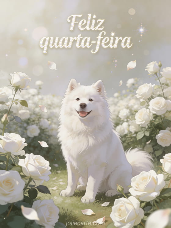 Envie uma saudação elegante de feliz quarta-feira com um samoyedo branco e fofo sentado em um jardim de rosas brancas. Veja também cachorro animado beijo gif feliz quarta-feira, boa quarta-feira texto ou foto bom dia boa quarta-feira.