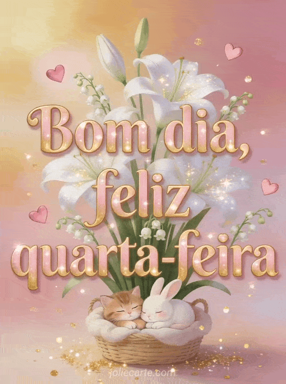 Compartilhe um cartão suave de bom dia feliz quarta-feira com letras rosa-douradas, corações rosados, muguet, lírios brancos majestosos e um gatinho aconchegado com um coelho em uma cesta acolhedora. Veja também feliz quarta-feira flores gifs, esta bom dia bom dia feliz quarta-feira imagem ou estas feliz quarta-feira fotos.