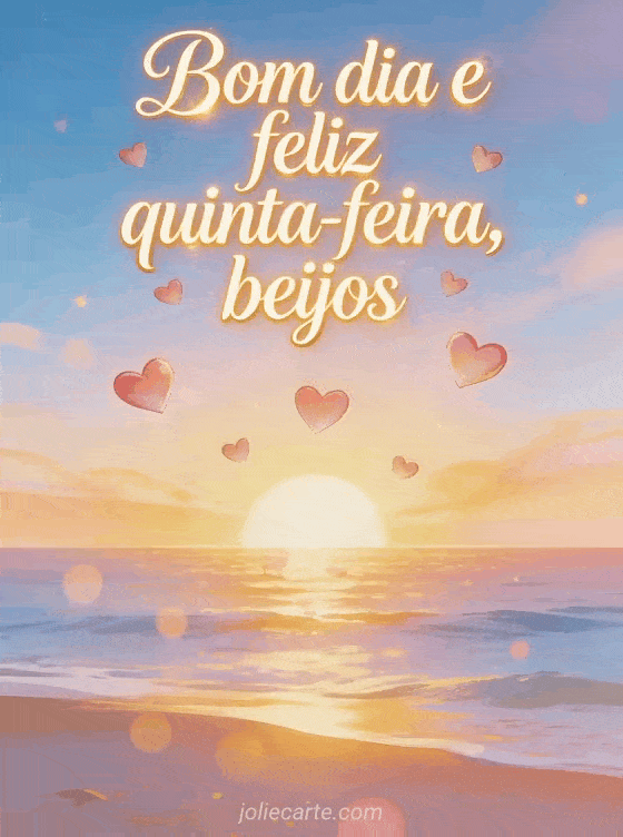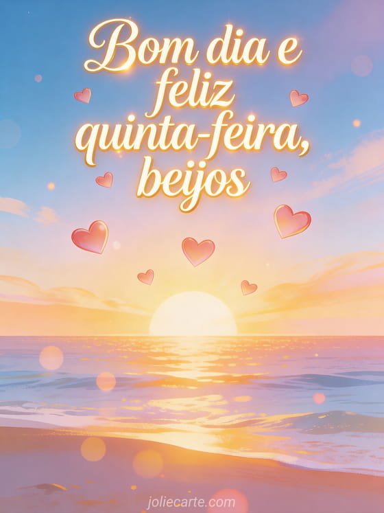 Compartilhe bom dia e feliz quinta-feira, beijos com caligrafia elegante, brilho caloroso, corações flutuando sobre um horizonte ensolarado, degradês sedosos, bokeh sutil e clima alegre. Veja também feliz quinta-feira sorriso, cartão animado feliz quinta-feira ou boa quinta-feira beijinhos.