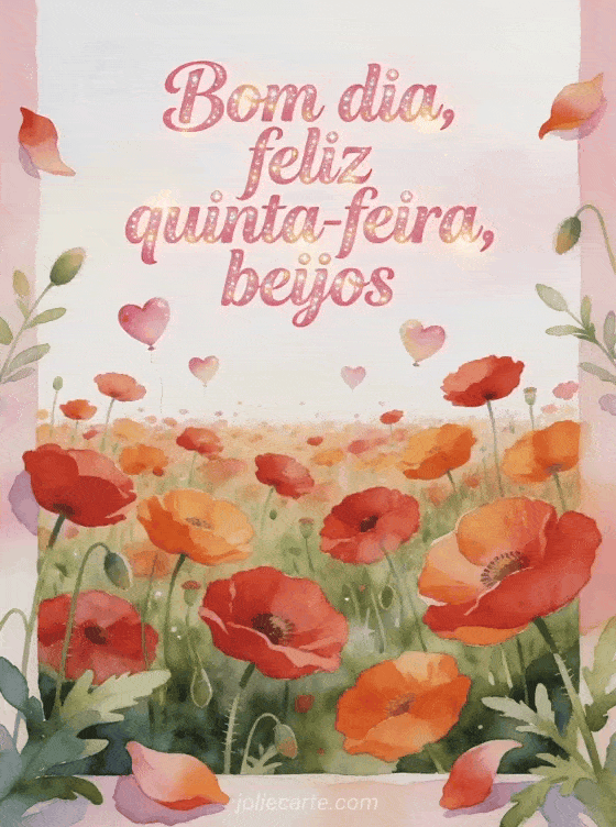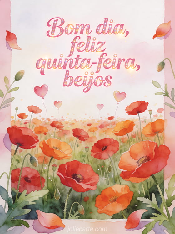 Compartilhe bom dia, feliz quinta-feira e beijos com uma campina viva de papoulas em aquarela e pequenos balões de coração flutuando sobre as flores. Envie este cartão terno e descubra também bom dia feliz quinta-feira citação, texto para desejar uma feliz quinta-feira ou feliz quinta-feira beijos gifs.