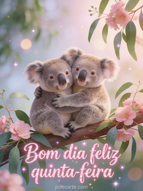 Alegre a quinta-feira de alguém com este cartão fofo com dois coalas se abraçando em galhos de eucalipto. Descubra também bom dia quinta chuvosa ou feliz quinta grandes beijos.