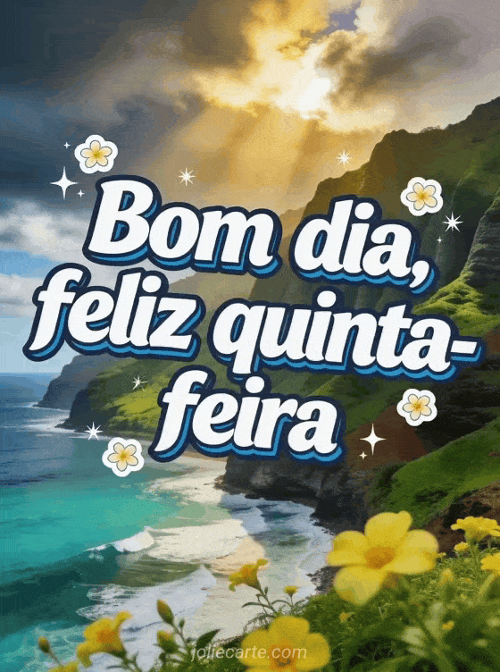Envie bom dia feliz quinta-feira esporte imagem com letras esportivas brancas, contornos azul-marinho, stickers de prímulas e estrelas cadentes sobre a costa de Na Pali no Havaí. Compartilhe um desejo cheio de energia durante a semana e veja também feliz quinta-feira chuvosa gif, cartões para desejar uma feliz quinta-feira ou belas imagens animadas feliz quinta-feira.