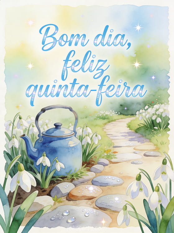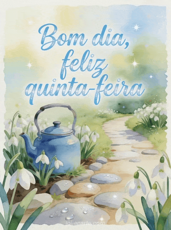 Compartilhe um cartão fresco de bom dia e feliz quinta-feira com flores de floco-de-neve, uma chaleira azul esmaltada, pedras com orvalho e um caminho de jardim luminoso. Veja também feliz quinta-feira gifs, bom dia e feliz quinta-feira imagem ou feliz quinta-feira café gif.