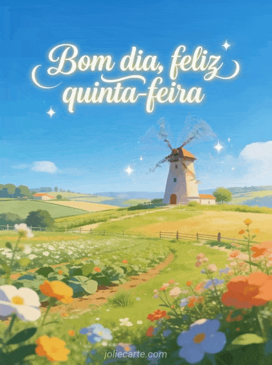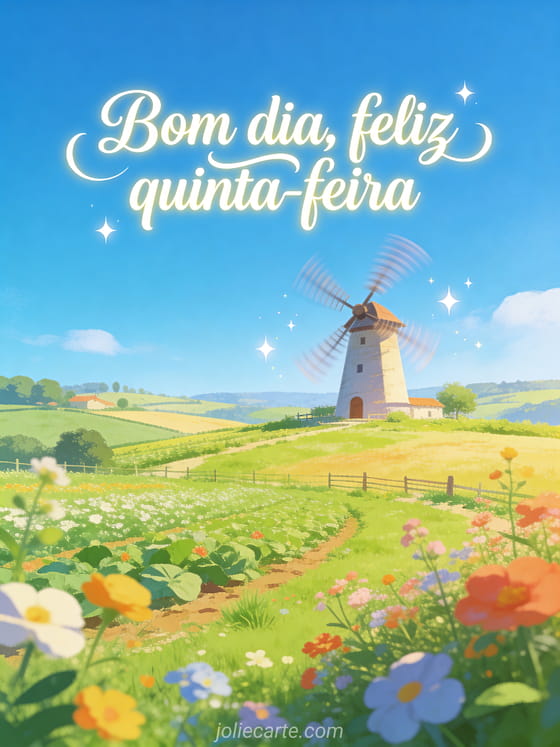 Compartilhe bom dia, feliz quinta-feira com caligrafia elegante, halo suave, campo colorido, um moinho girando sob céu azul claro, brilho delicado e clima fresco. Veja também bom dia feliz quinta-feira beijos imagens, feliz quinta-feira sorriso ou cartão animado feliz quinta-feira.