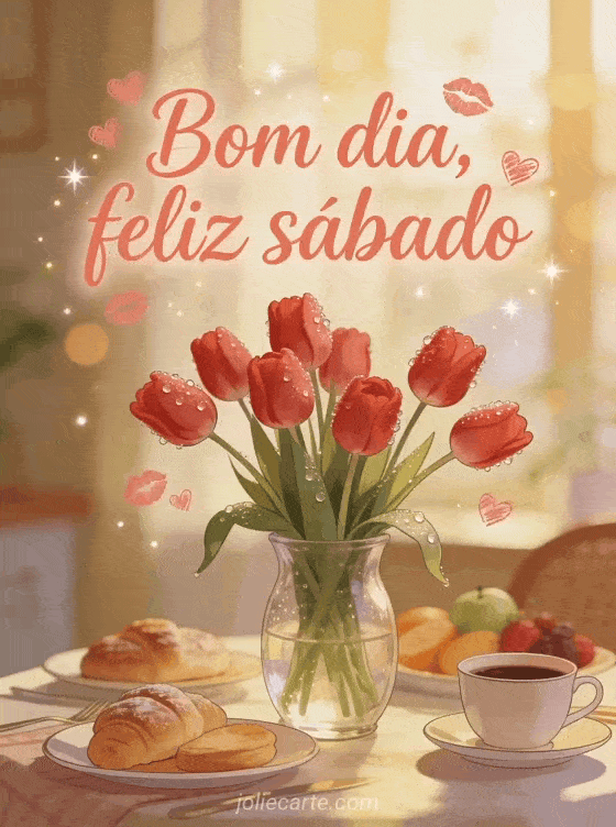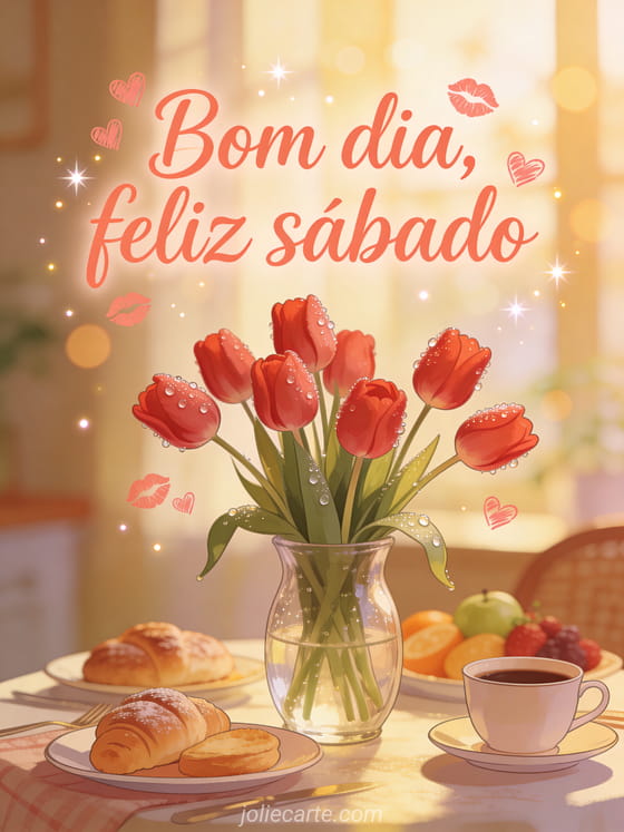 Compartilhe bom dia feliz sábado beijos com tulipas vermelhas em um vaso de vidro cobertas de orvalho da manhã, em uma cena romântica de café da manhã. Envie mais alegria de sábado com paisagem feliz sábado paisagem, feliz sábado engraçado ou gifs de feliz sábado.