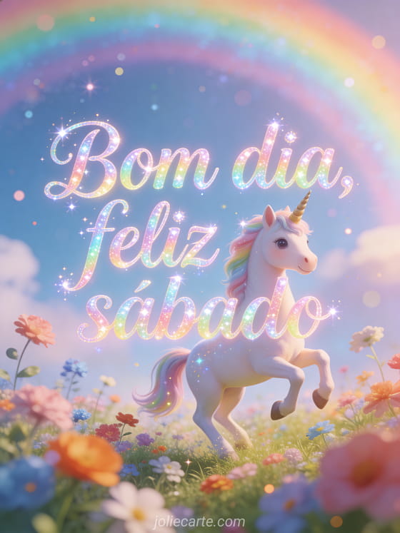 Compartilhe uma saudação encantadora de feliz sábado com um unicórnio adorável trotando entre flores coloridas, um arco-íris ao fundo e brilhos mágicos. Veja também feliz sábado carinha, bom sábado com gatos ou imagens de beijos de sábado.