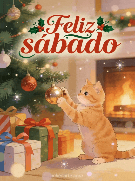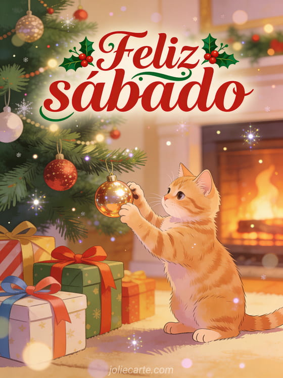 Compartilhe um cartão acolhedor de feliz sábado Natal com letras vermelhas e verdes, uma árvore decorada, um lindo gato ruivo brincando com um enfeite, presentes embrulhados e o brilho da lareira. Veja também feliz sábado imagens engraçadas ou feliz sábado com gatos.