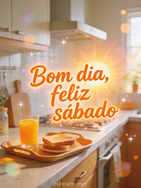 Compartilhe bom dia feliz sábado com uma bandeja de café da manhã com suco de laranja fresco e torradas em uma cozinha luminosa pela manhã. Comece o fim de semana com salam aleykoum feliz sábado, gif de café feliz sábado ou bom sábado gifs.