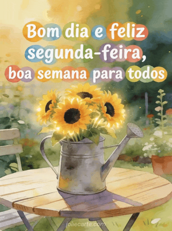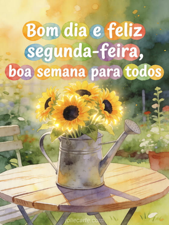 Compartilhe uma alegre saudação de segunda-feira com este luminoso cartão que mostra um buquê de girassóis em um regador sobre uma mesa de jardim. Você também pode descobrir imagens café boa segunda-feira, foto feliz segunda-feira ou imagem para dizer boa segunda-feira.
