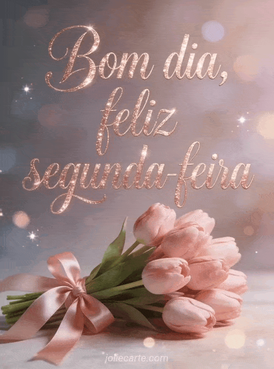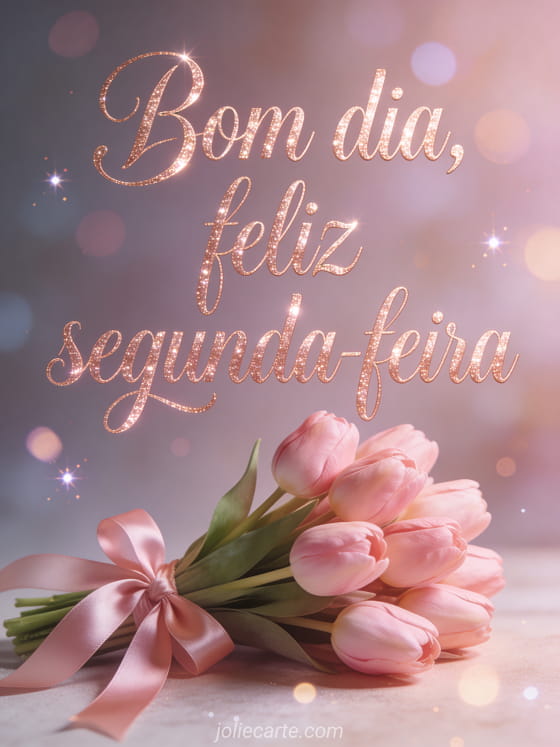 Envie uma saudação carinhosa de bom dia feliz segunda-feira com um buquê de tulipas rosas amarrado com fita de cetim, brilho rosé dourado e bokeh suave. Veja também bom dia segunda-feira imagem, boa semana e feliz segunda-feira imagem ou feliz segunda-feira cartão.
