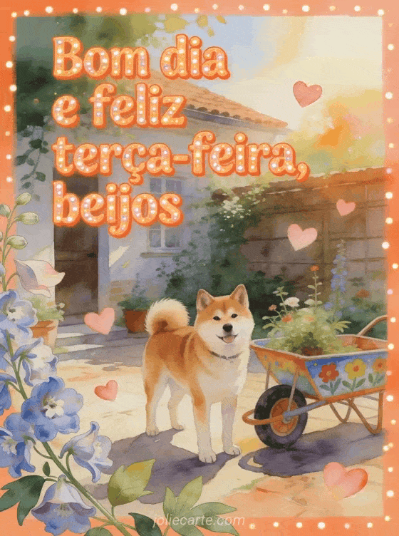 Compartilhe bom dia, feliz terça-feira e beijos com um akita inu ao lado de uma carreta de jardim pintada, pétalas de delfínio e corações flutuantes. Veja também boa terça-feira imagens, feliz terça-feira gatos gif ou gif bom dia e boa terça-feira.