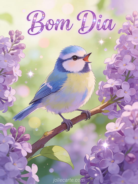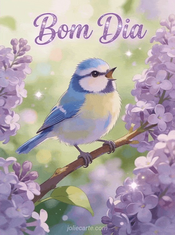 Um gif fresco e alegre de bom dia com um adorável chapim-azul cantando em um galho de lilás em flor, em um jardim de primavera. Descubra também uma mensagem bom dia madrugador, uma mensagem bom dia para o amor ou olá gifs.