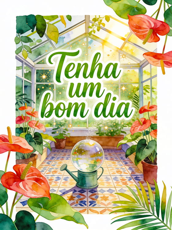 Envie uma mensagem acolhedora de bom dia com letras verdes em aquarela, antúrios, um globo de rega de vidro, azulejos estampados e folhas tropicais em uma estufa matinal. Veja também um bom dia chuva gif, uma bom dia beijos imagem animada ou um bom dia ótimo dia gif animado gif animado.