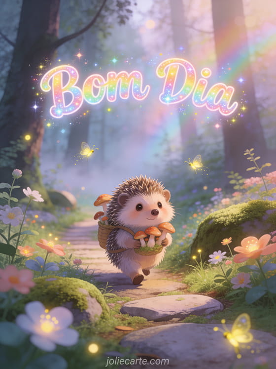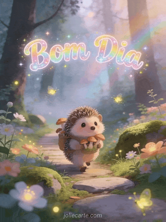 Envie um mágico gif de bom dia com este cartão grátis com um fofo ouriço carregando cogumelos por uma floresta encantada. Descubra também bom dia meu amor ou imagens bom dia.