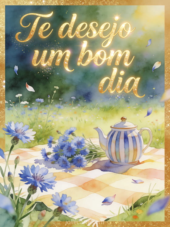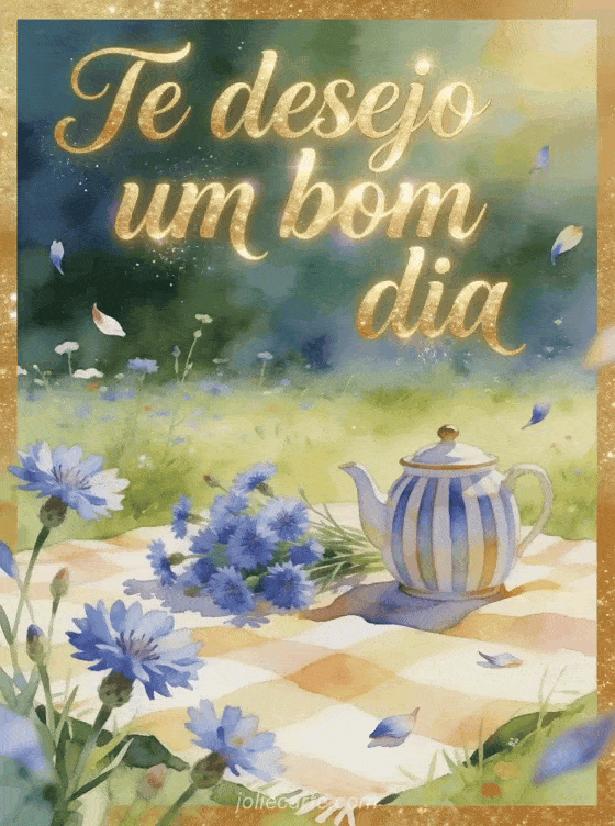Compartilhe gifs de bom dia com letras douradas elegantes, uma cena de piquenique na campina, flores de centáurea e um bule listrado na luz da manhã. Você também pode enviar bom dia chuvoso gif, um cartão de bom dia chuvoso ou beijinhos gif bom dia beijinhos te amo.