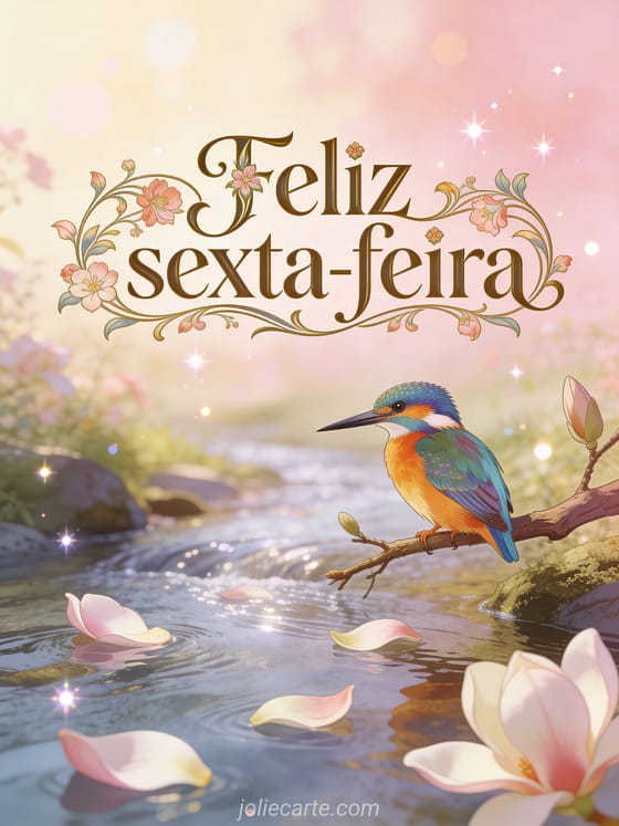 Compartilhe uma saudação refinada de sexta-feira com um martim-pescador colorido pousado sobre um riacho, pétalas de magnólia na água e suave luz da manhã. Veja também bom dia sexta-feira humor engraçado, uma imagem de beijos de sexta-feira ou um cartão beijos de sexta-feira.