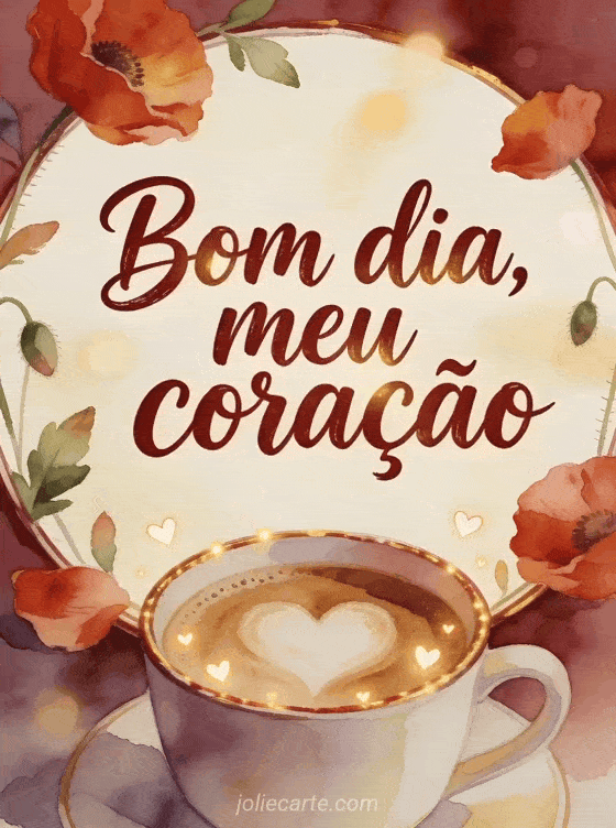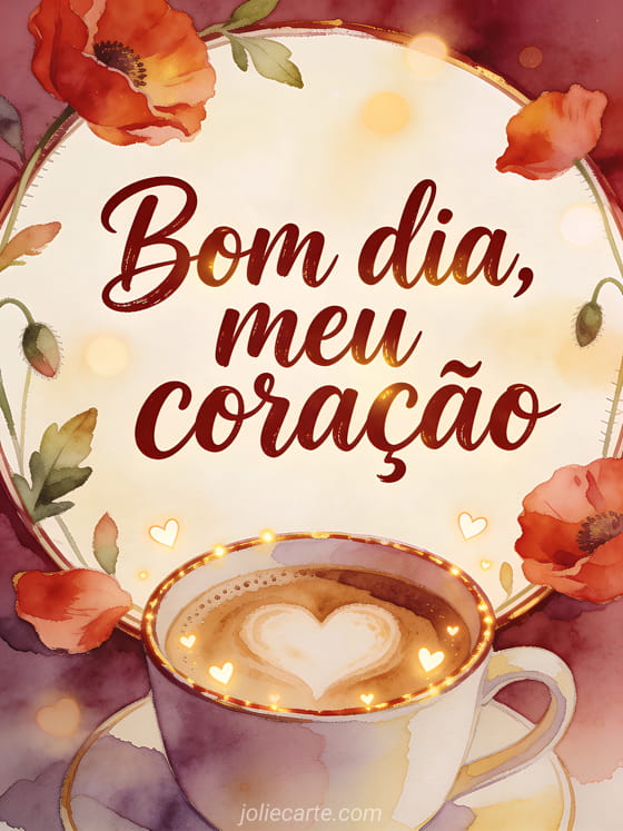 Compartilhe um momento amoroso de manhã com este cartão em aquarela, com uma xícara de café com espuma em forma de coração, pétalas de papoula, folhas e pequenos corações brilhantes. Veja também bom dia café café, gifs de bom dia com café ou bom dia café ternura.
