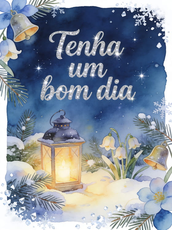 Deseje um bom dia com um jardim de inverno aconchegante, uma lanterna acesa, neve suave, ramos de pinheiro e campânulas em luz quente de aquarela. Compartilhe este cartão brilhante e descubra também bom dia imagem com beijos, bom dia sol gif ou bom dia paisagem gif.