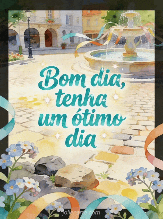 Compartilhe bom dia, tenha um ótimo dia com uma fonte de praça em aquarela, fitas ao vento, flores de aubrieta e pedras iluminadas pelo sol. Você também pode enviar um bom dia também gif, um bom dia fada gif ou um bom dia beijos gif animado.