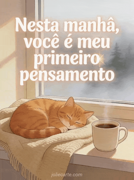 Compartilhe uma mensagem calorosa com este cartão grátis de bom dia com um gato ruivo dormindo, uma xícara de café fumegante e uma suave vista da janela. Veja também texto bom dia meu amor à distância, bom dia meu amor à distância ou desejar bom dia ao amor à distância.