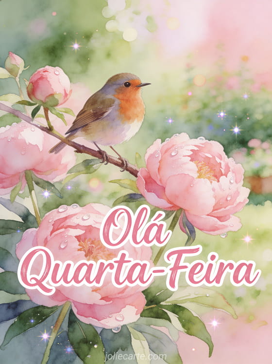 Comece sua quarta-feira com serenidade enviando este poético cartão Olá Quarta-Feira com um pintarroxo sobre peônias rosas florescendo com orvalho matinal. Descubra também um cartão Boa Quarta-feira gatinhos.