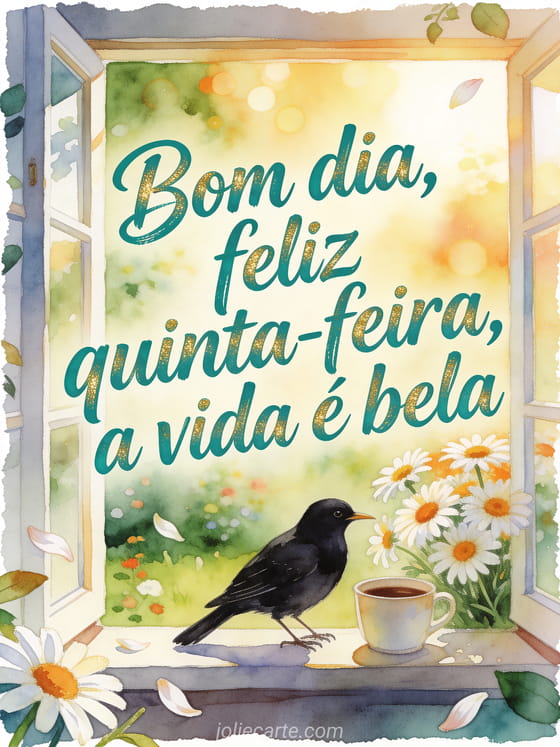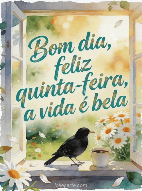 Compartilhe uma mensagem alegre de quinta-feira com letras esmeralda, brilho dourado, um melro perto de uma xícara de café, margaridas luminosas e uma janela aberta para o jardim com luz quente da manhã. Você também pode enviar uma feliz quinta-feira imagem animada, bom dia feliz quinta-feira beijos imagens ou uma bom dia feliz quinta-feira citação.