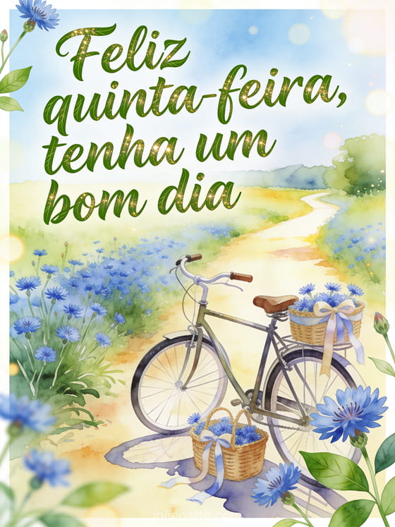 Deseje uma boa quinta-feira com uma bicicleta vintage em uma estrada ensolarada, centáureas azuis e cestas com fitas na luz suave do campo. Veja também um feliz quinta-feira com citação, um feliz quinta-feira gato gif ou uma imagem para desejar feliz quinta-feira.