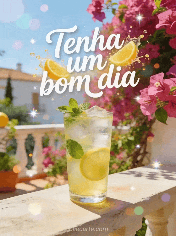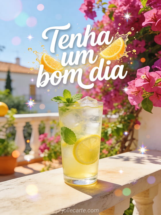 Envie uma saudação ensolarada de bom dia com letras cítricas, limonada refrescante com hortelã e gelo em um terraço com buganvília. Veja também feliz quinta-feira gato, cartão bom dia quinta-feira ou feliz quinta-feira mensagem.