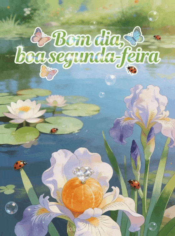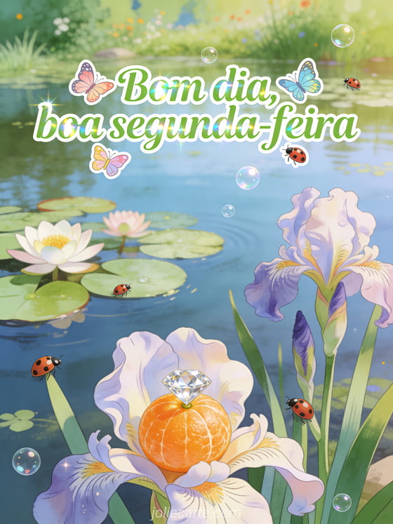 Envie uma mensagem suave de segunda-feira de manhã com um lago tranquilo, nenúfares, íris-d'água floridas, borboletas coloridas e um diamante-mandarim pousado em uma íris. Veja também boa semana e feliz segunda-feira imagem, um feliz segunda-feira cartão ou cartões virtuais boa segunda-feira.