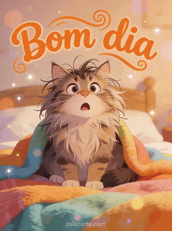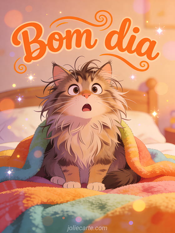 Compartilhe uma saudação brincalhona de bom dia com letras laranja saltitantes, um gato Maine Coon fofo com pelo bagunçado e expressão surpresa em uma cama aconchegante com cobertores coloridos. Veja também um gif de feliz sexta-feira paisagem, um cartão de bom dia de sexta-feira com beijos ou uma imagem de bom dia sexta-feira.