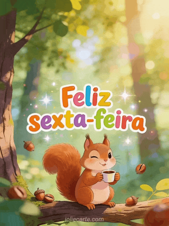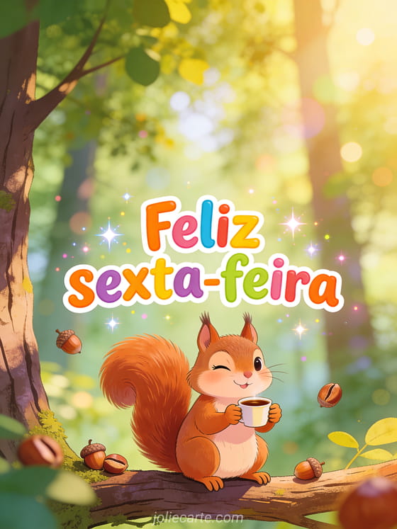 Compartilhe uma saudação leve de sexta-feira com um esquilo sapeca piscando e segurando uma xícara minúscula de café em um galho da floresta, com bolotas ao redor. Veja também um bonito cartão boa sexta-feira, bom dia feliz sexta-feira praia ou imagem engraçada imagem engraçada feliz sexta-feira humor.