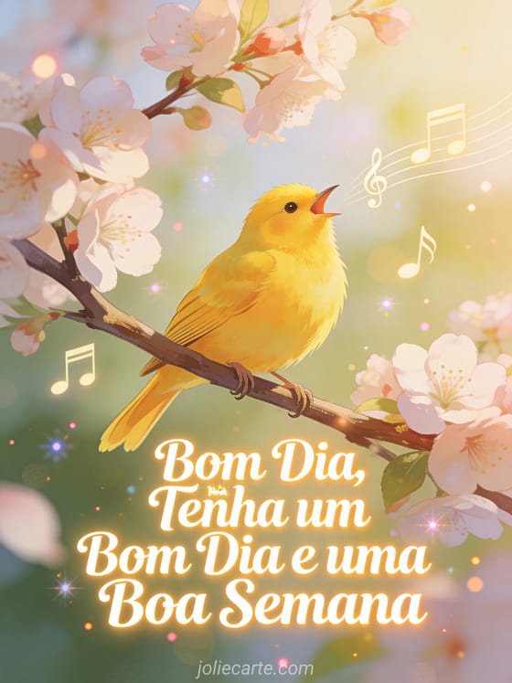 Deseje bom dia e uma boa semana com este encantador cartão que mostra um canário amarelo cantando em um galho de flores de cerejeira com notas musicais flutuando ao redor. Descubra também um bom dia e boa semana ou um boa semana humor.
