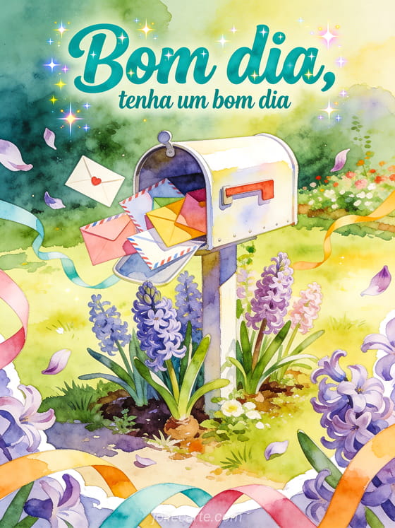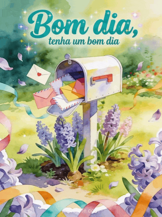 Envie uma saudação alegre de bom dia e tenha um bom dia com letras verde-azuladas animadas, marcas brilhantes, uma caixa de correio luminosa no jardim, flores de jacinto, envelopes coloridos e fitas esvoaçantes. Você também pode compartilhar bom dia ótimo dia beijos imagens, tenha um bom dia gif animado bom dia tenha um bom dia ou bom dia neve gif.