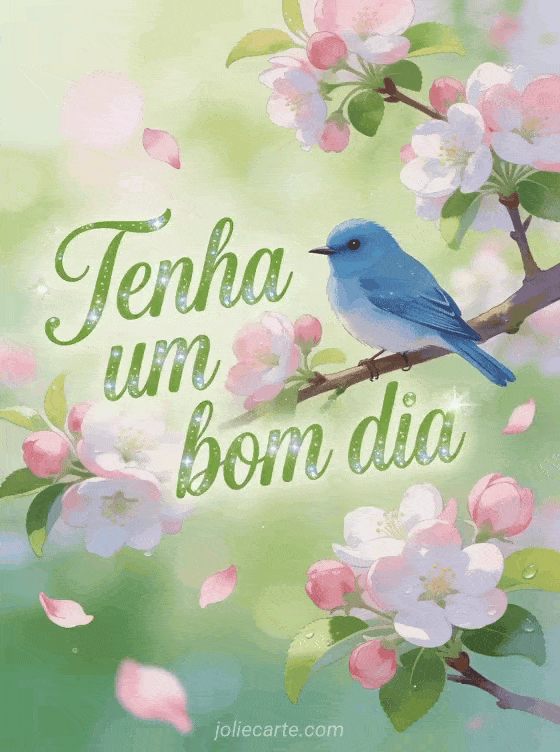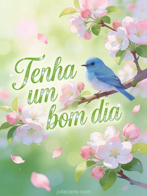 Envie uma saudação fresca de tenha um bom dia com um pássaro azul encantador pousado em um galho de macieira florida, cercado por flores rosas e brancas. Veja também feliz quarta-feira esquilo, feliz quarta-feira gif animado ou todos os dias penso em você yosa prod.