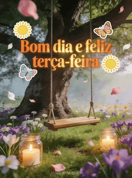Deseje uma bela terça-feira com texto laranja luminoso, pequenos sóis, borboletas alegres, um balanço de madeira sob um grande carvalho e velas em potes de vidro sobre uma campina florida. Veja também uma imagem grátis de feliz terça-feira beijos, uma zen ternura citação positiva feliz terça-feira ou um passar uma feliz terça-feira.