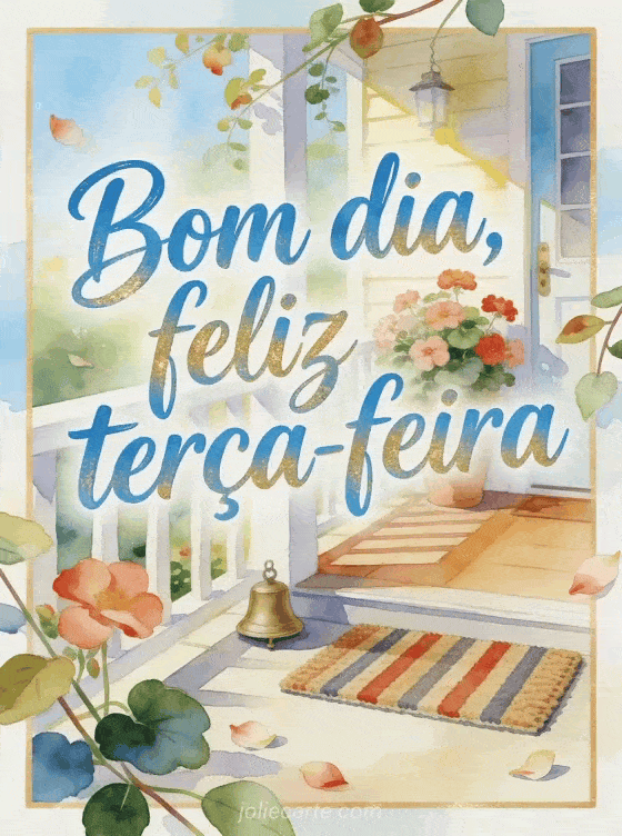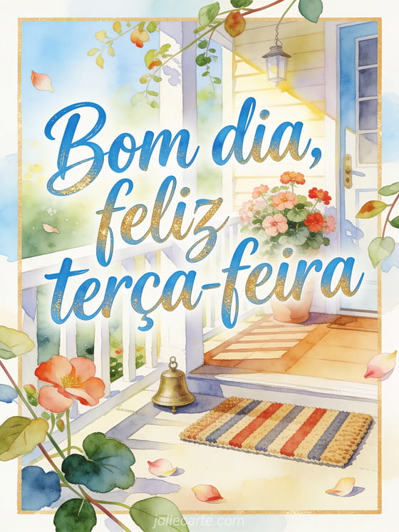 Envie uma saudação acolhedora de bom dia e feliz terça-feira com uma varanda iluminada, begônias, um capacho listrado e um pequeno sino de latão. Veja também feliz terça-feira minha amiga imagem, imagem animada para terça-feira ou feliz terça-feira beijos imagens animadas.