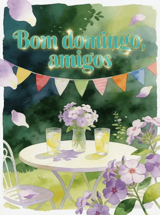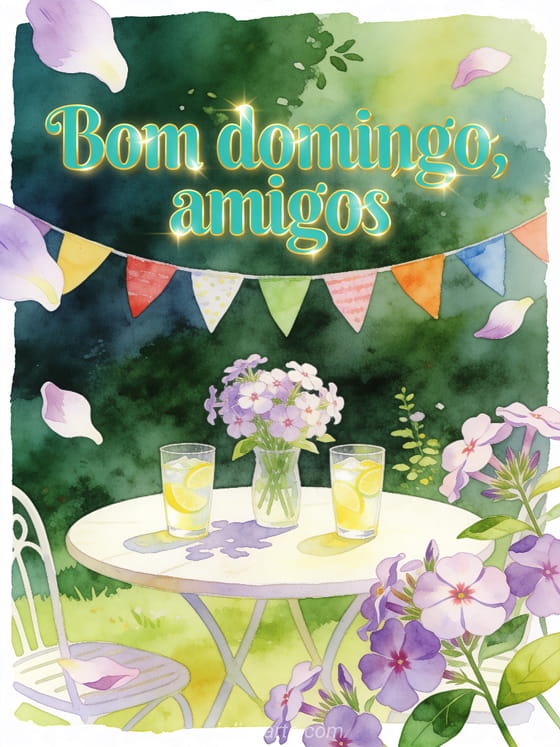 Envie bom domingo amigos imagens com letras turquesa, uma mesa redonda de jardim, copos de limonada, flores de phlox e uma guirlanda colorida. Veja também uma feliz domingo buquê de flores imagem, uma feliz domingo cinza imagem ou bom domingo ensolarado gifs.