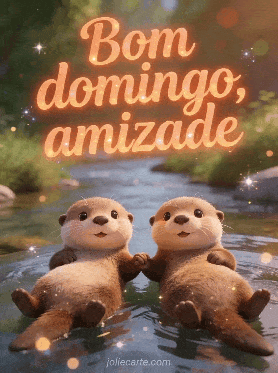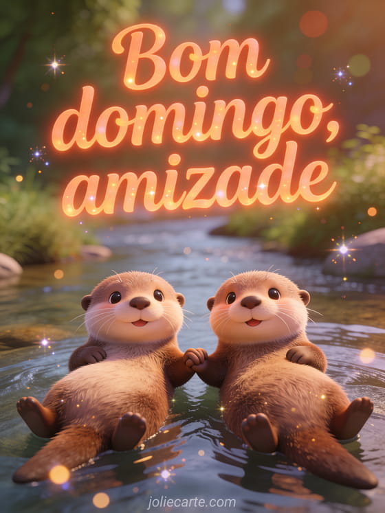 Compartilhe bom domingo amizade com letras terracota quentes, duas lontras fofas de desenho animado de mãos dadas enquanto flutuam de barriga para cima, um cenário de rio e expressões adoráveis. Veja também bom domingo no Senhor ou feliz domingo gif animado brilhante.