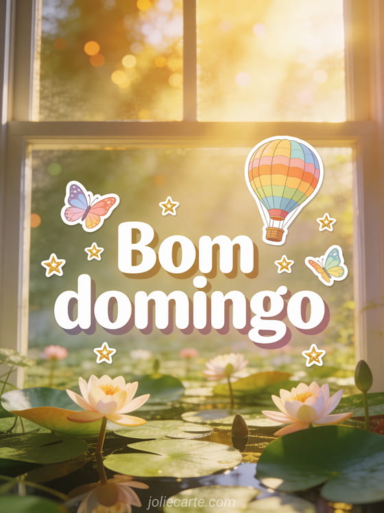 Envie um cartão poético de bom domingo com letras brancas arredondadas, borboletas coloridas, estrelas douradas e um balão de ar quente sobre nenúfares em flor. Veja também olá e bom domingo, bom domingo aconchegante imagem ou feliz domingo imagens muito bonitas.