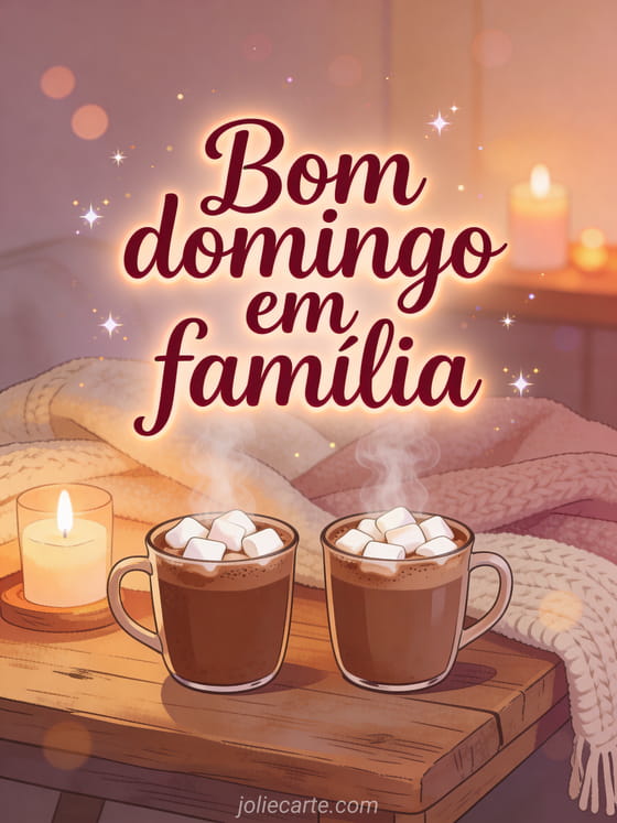 Compartilhe bom domingo em família em uma cena acolhedora com letras vinho, canecas de chocolate quente fumegante, marshmallows, mantas macias e luz de velas em uma mesa rústica. Veja também bom dia domingo imagem ou bom domingo meu amor beijos.