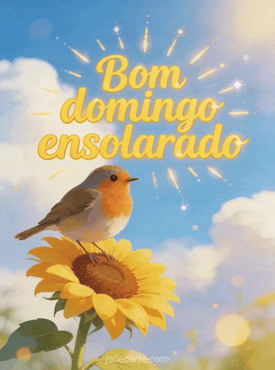 Compartilhe um gif de bom domingo ensolarado com letras amarelas brilhantes, um passarinho pousado em um girassol, luz dourada de manhã de verão e céu azul com nuvens fofas. Veja também imagem de feliz domingo ou bom domingo em família.