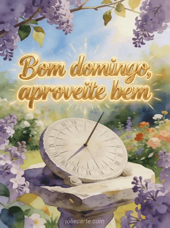 Envie bom domingo ensolarado gifs com letra dourada, um relógio de sol de pedra em um jardim florido e ramos de lilás sob o sol claro. Veja também um feliz domingo mulher gif, feliz domingo gifs gratuitos ou imagens animadas para desejar um bom domingo.