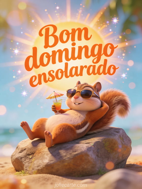 Compartilhe uma imagem de bom domingo ensolarado com letras laranja brilhantes, um esquilo de desenho animado tomando sol em uma pedra, óculos escuros, uma bebida pequena com guarda-chuvinha e clima de férias de verão. Veja também mensagem de bom domingo para uma amiga ou bom domingo cartão gif.