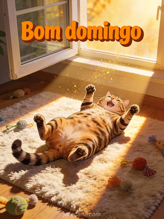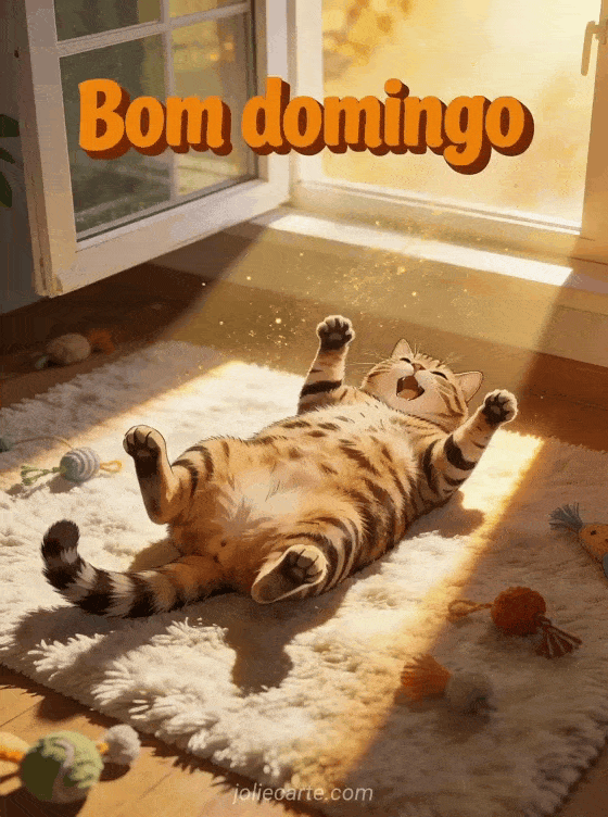 Compartilhe uma saudação divertida de domingo com um gato rajado gordinho de barriga para cima em um raio dourado de sol, patas no ar, brinquedos ao redor e felicidade total. Você também pode enviar bom domingo minha amiga ou feliz domingo gif humor.