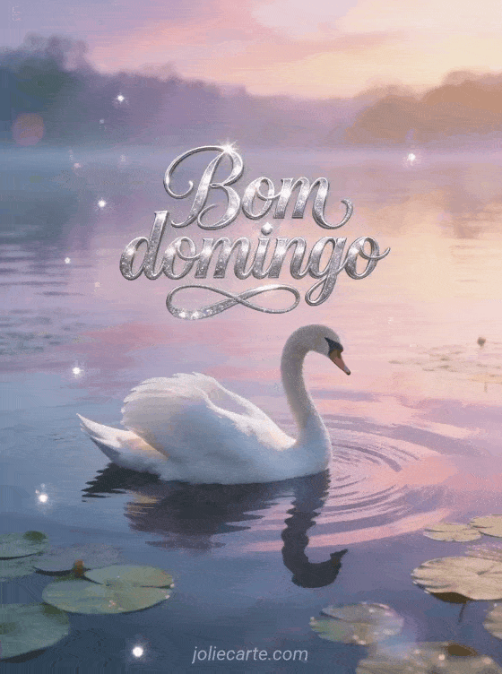 Compartilhe gifs animados de bom domingo com letras prateadas elegantes, um cisne branco deslizando em um lago calmo ao amanhecer, reflexos rosas e roxos e folhas de vitória-régia. Veja também bom dia domingo cartão ou bom domingo ensolarado gif.