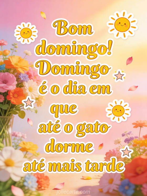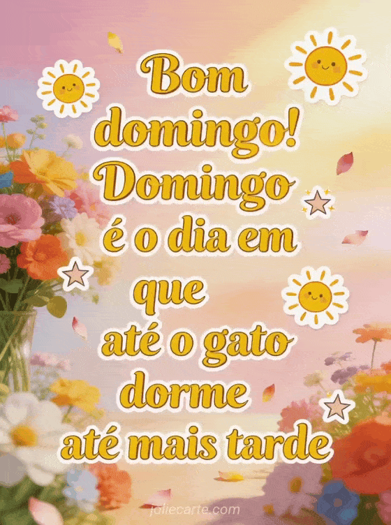 Compartilhe uma piada alegre de bom domingo com letras ensolaradas, estrelas brincalhonas, um buquê de flores coloridas e pétalas flutuando na luz quente da tarde. Veja também bom domingo imagens grátis, uma bom dia domingo imagem bonita ou bom domingo muitos beijos gif.