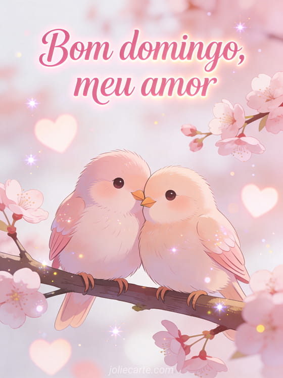 Compartilhe uma saudação romântica de domingo com dois pássaros inseparáveis abraçados em um galho, flores de cerejeira e luzes em forma de coração. Você também pode enviar bom domingo animado ou gifs animados joaninha bom domingo.