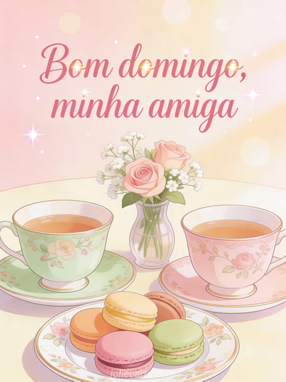 Compartilhe bom domingo minha amiga com letras rosas quentes, uma elegante mesa de chá da tarde para duas pessoas, xícaras bonitas, macarons, flores frescas e um clima suave de amizade. Veja também feliz domingo gif humor ou cartão virtual bonito feliz domingo.