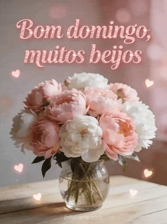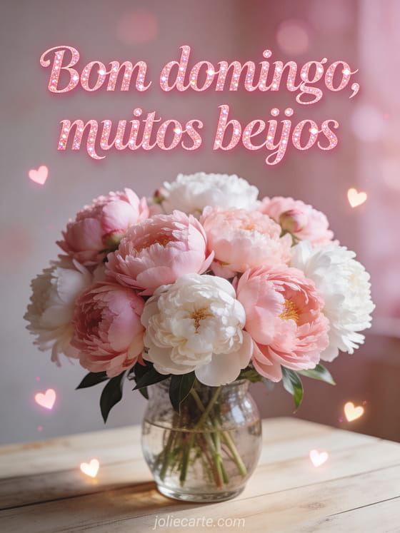 Compartilhe uma saudação terna de domingo com um buquê generoso de peônias rosas e brancas em um vaso de vidro, corações luminosos e luz rosada suave. Você também pode enviar feliz domingo paisagem linda ou feliz domingo engraçado gif.