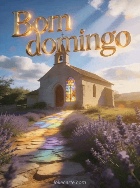 Compartilhe uma saudação luminosa de domingo com uma capela do campo, luz dourada da manhã, reflexos coloridos de vitrais, um caminho de pedra e lavanda em flor. Você também pode enviar feliz domingo gif animado brilhante ou bom dia bom domingo e tenha um bom dia.